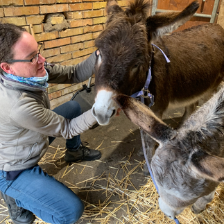 Jedenfalls hat es Frauchen wieder mal gut gemeint mit uns und hat Christine Droz zu Besuch eingeladen. Christine ist Pferdeosteopathin. Pferdeosteopathin und erfahrene Pferdefrau - aber bisher nur wenig erfahrene Eselfrau. Wir kennen sie aber bereits, da sie uns jeden Sonntagmorgen füttert und ich am alten Ort schon mal von ihr behandelt worden bin...